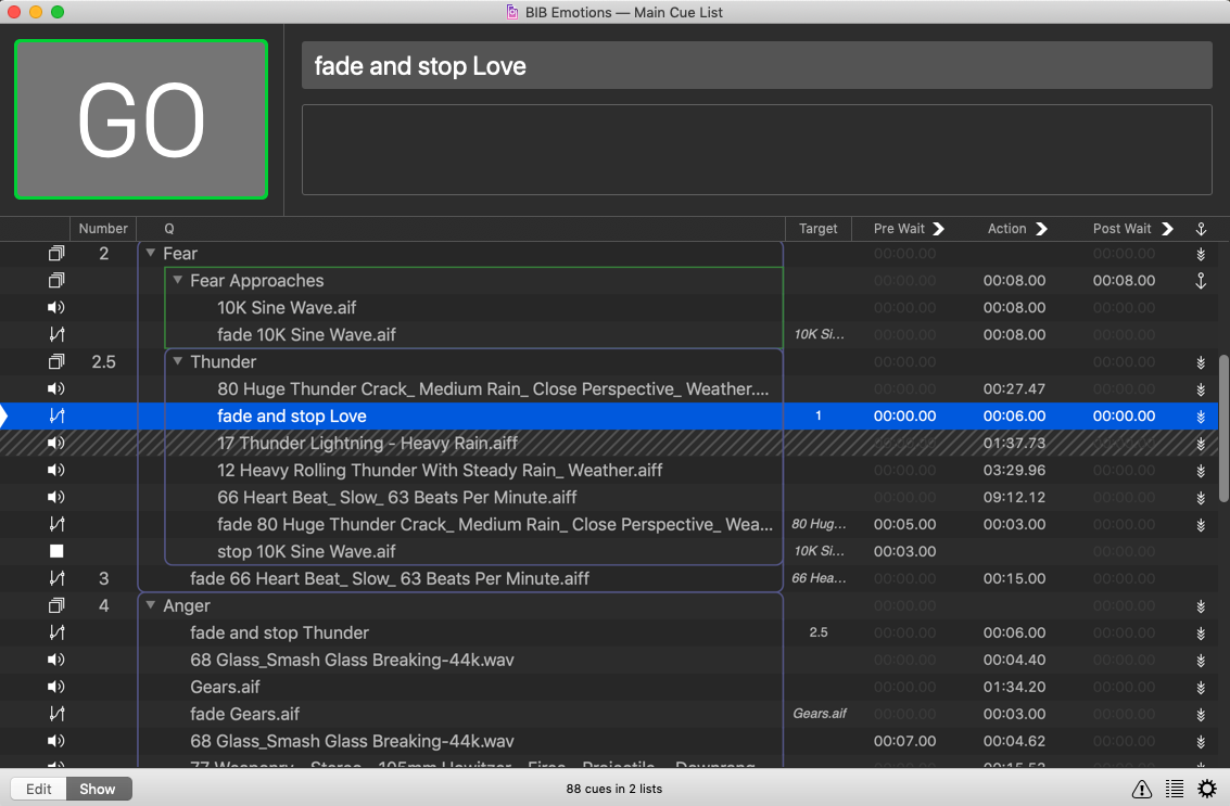 This gallery shows the Qlab programming for the piece. Numbered cues were manually fired, with all others being timed to start within a group cue. The music was an original composition and ran utilizing loops and devamp cues.